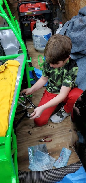 Woo-hoo seat, steering wheel, and pretty much everything but the left spindle and tire is on in the front!! Getting closer!!